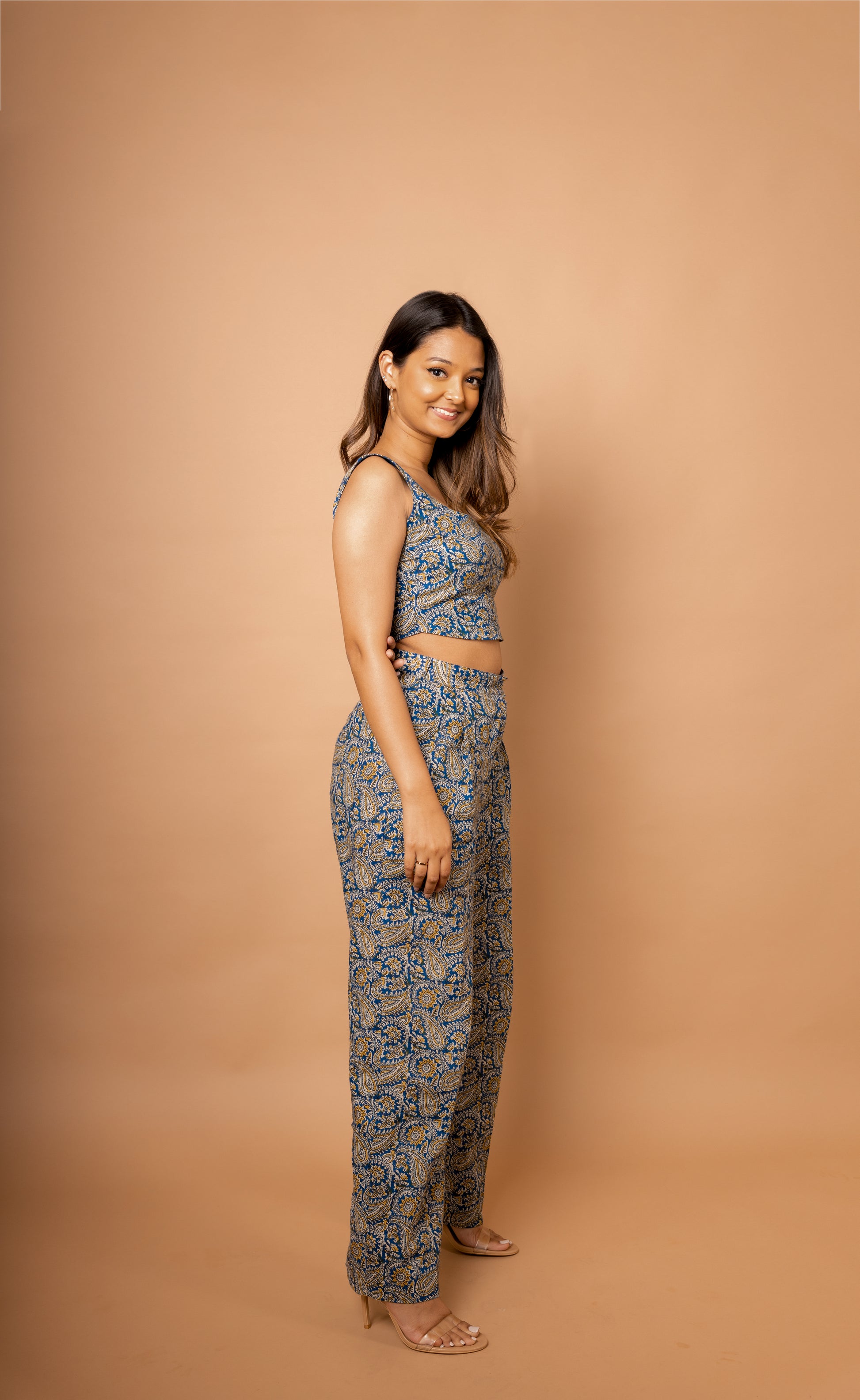 A perfect blend of the traditional and the modern, this light blue paisley printed Co-ord set with relaxed high-waist trousers and a corset-style crop top that can be cinched at the back is a chic and versatile choice for the modern woman whose day doesn’t end at the 9-5. It is well suited as a coordinated day look as well as can be mixed with other pieces to create unique and exciting outfits.