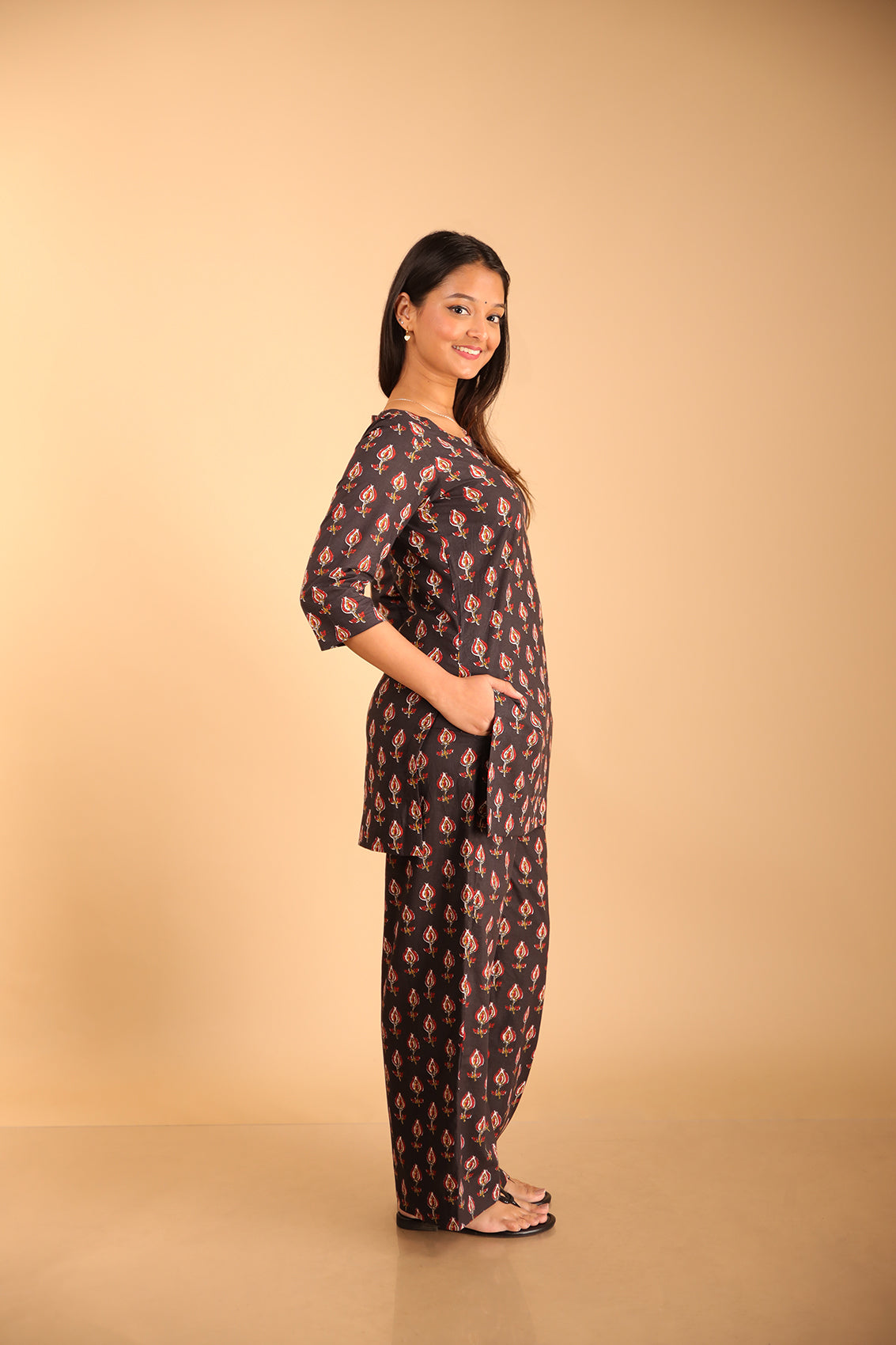 Immerse yourself in chic comfort with our Black Floral Print Lounge Wear Co-ord Set. The short kurta, featuring a round V-neck and quarter sleeves, is adorned with a sophisticated black floral print, adding a touch of understated elegance to your lounging experience.