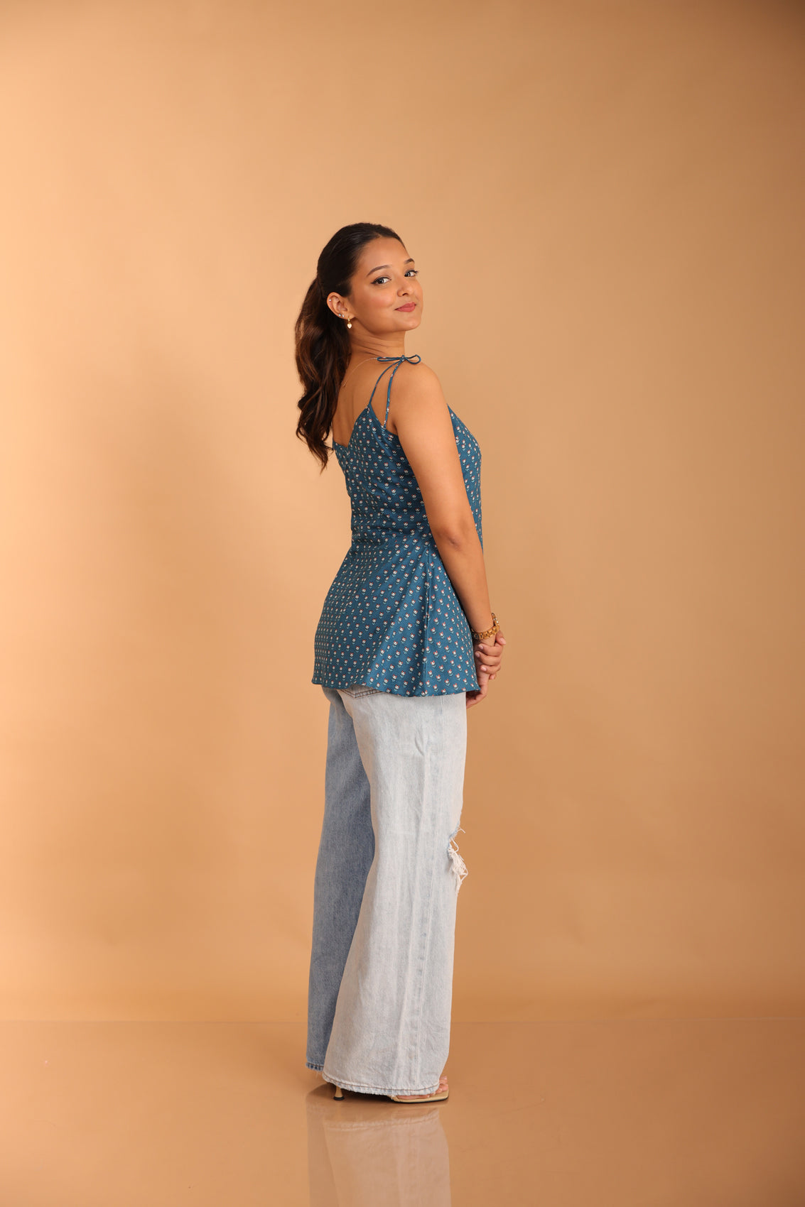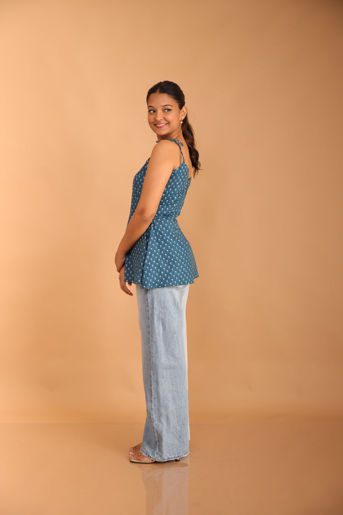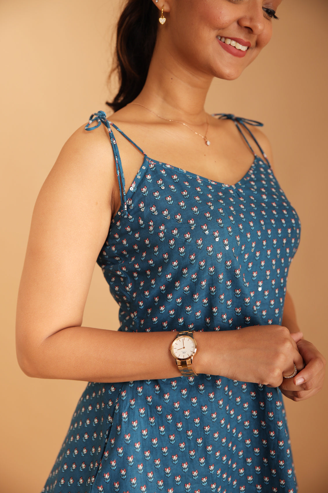 Experience serenity in our La-La blue printed strappy short kurti. The V-neck, accented with tie-up straps, exudes effortless style. A pocket on one side adds practicality. The silver sequin work at the yoke offers subtle elegance. Crafted from breezy cambric cotton, this kurti is perfect for those who seek comfort without compromising on fashion.