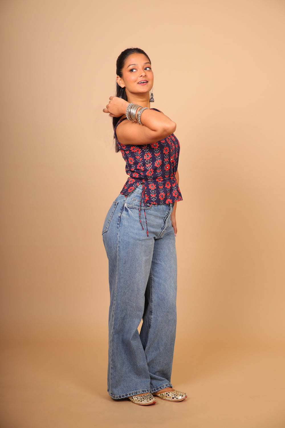 With its round neckline and adjustable waist strings, this blue printed sleeveless top is the perfect addition to any outfit. Its intricate mirror detailing adds a touch of sparkle, making it ideal for dressing up your summer wardrobe. Whether you want to add a pop of glamour to your look or create a tailored fit, this top has got you covered!