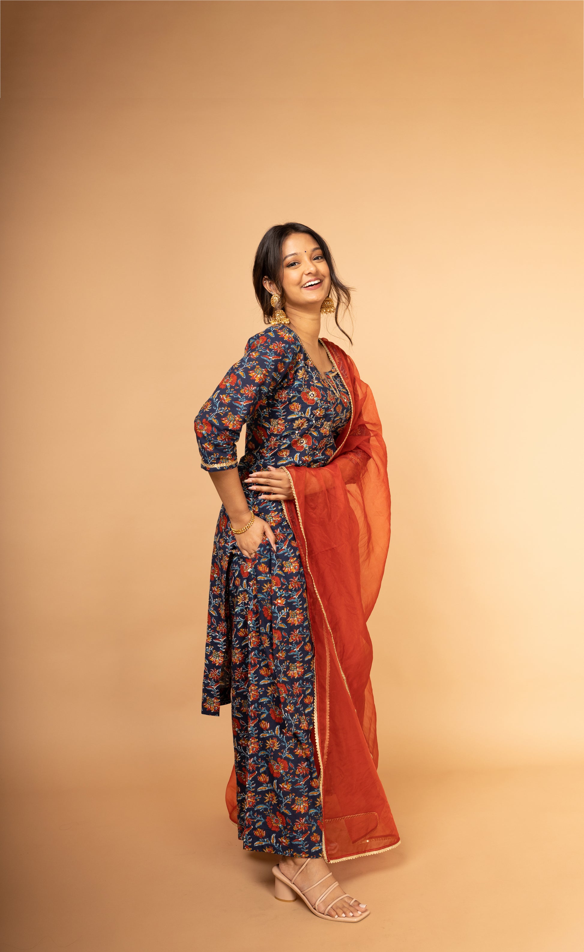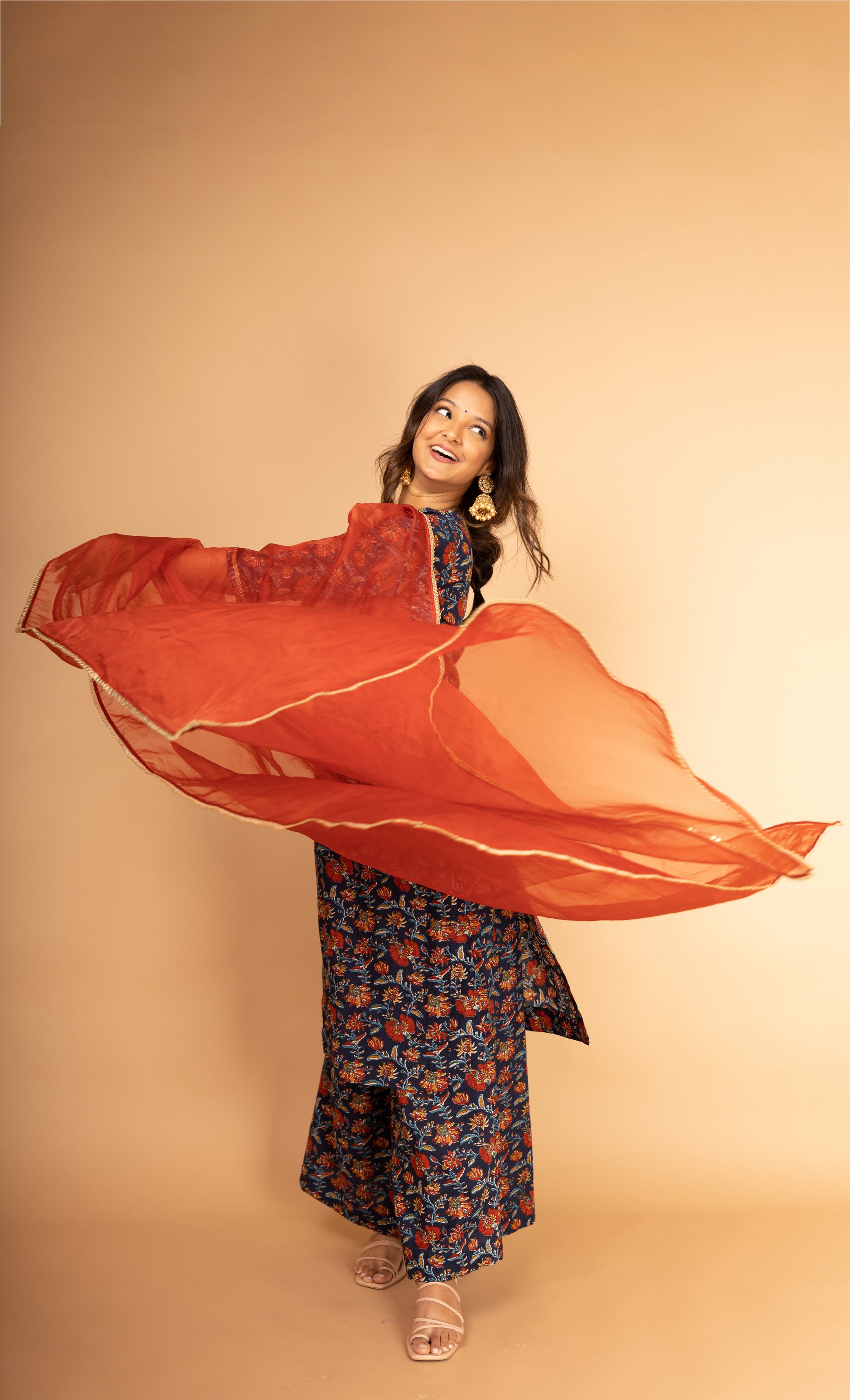 This dark blue Floral Hand Embroidered Suit (3-piece set) with a straight fit kurta featuring hand embroidered mirror and sequin work as well as leaf detailing and lace work around the neck and sleeves comes with coordinating semi elasticated pants and a contrasting orange sheer dupatta embellished with golden lace. It is perfect for a breezy day look as well as can be amped up with accessories for special occasions.