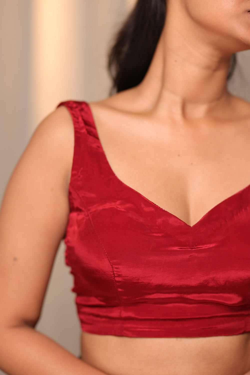 This maroon crepe blouse features a paan-shaped neckline, a sleeveless design, and a padded fit for a neat and elegant look. Designed with a round back neck, it is ideal for weddings and festive occasions.