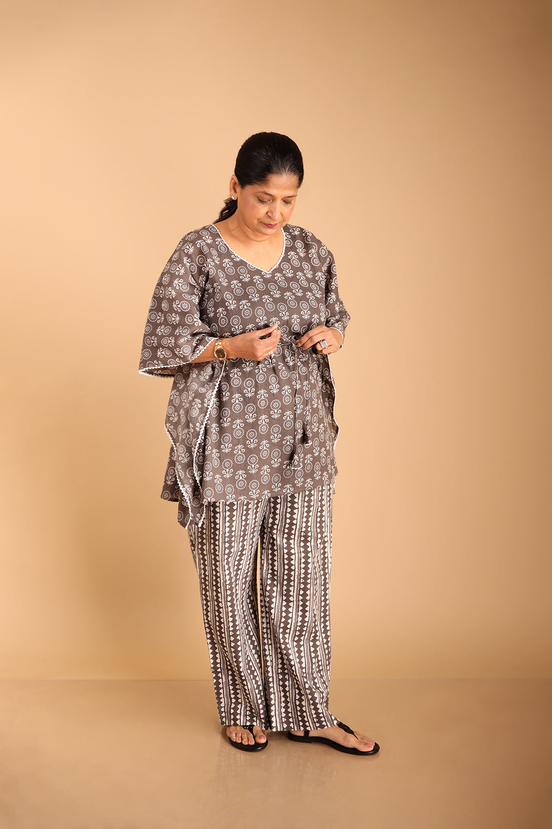 Indulge in unparalleled comfort and effortless style with our floral Lounge Wear Co-ord Set. This ensemble features a chic V-neck short kaftan adorned with delicate lace detailing at the neckline and sleeves, adding a touch of sophistication to your leisure time.
