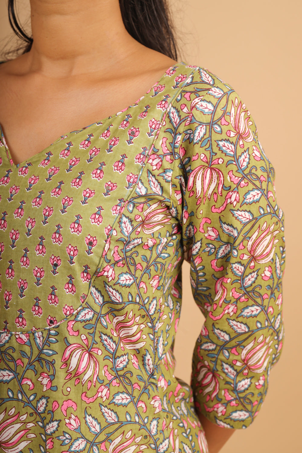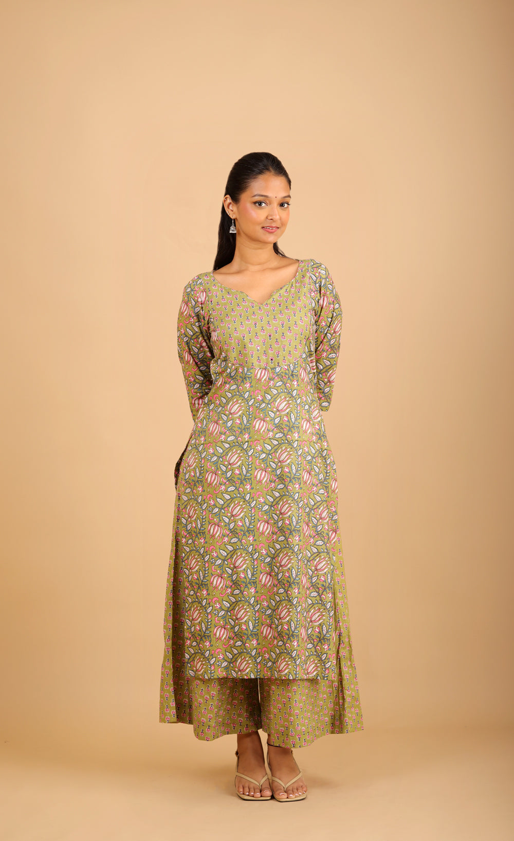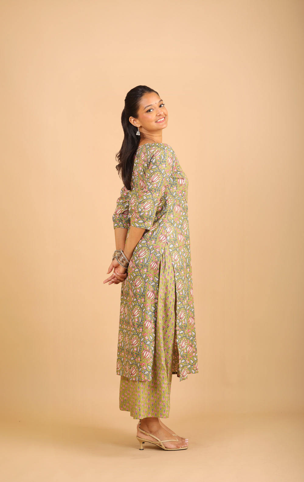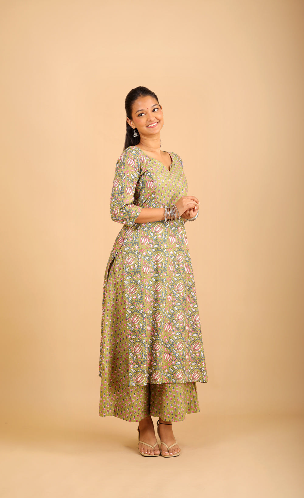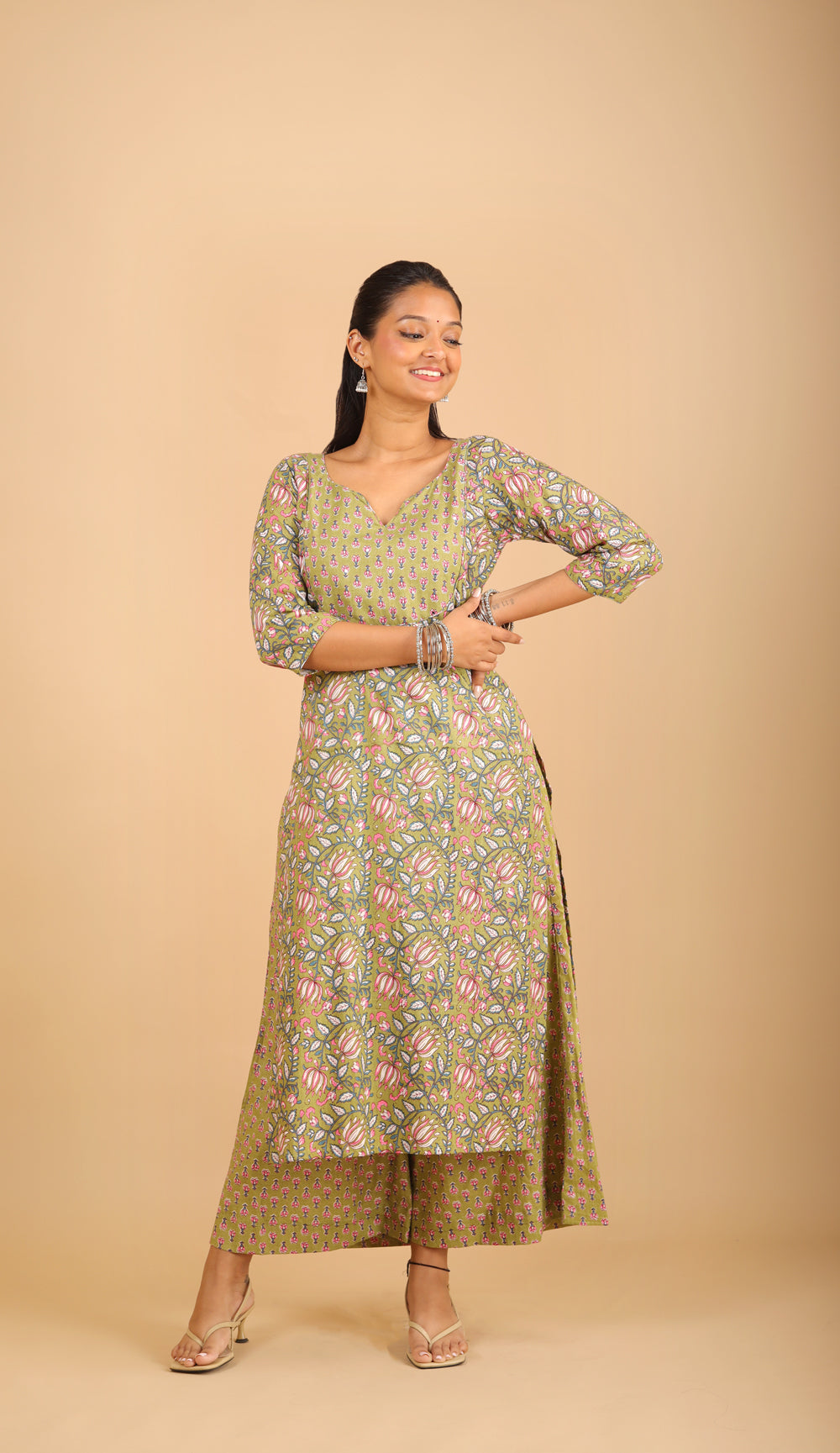 Celebrate this festive season in our Sage Green Cotton Kurta Set, designed with a flattering round V-neckline adorned with patchwork and shimmering sequins. Featuring comfortable 3/4 sleeves and paired with ankle-length loose palazzo pants with pockets, this set blends style and ease for Navratri, Karwa Chauth, Diwali or wedding celebrations.