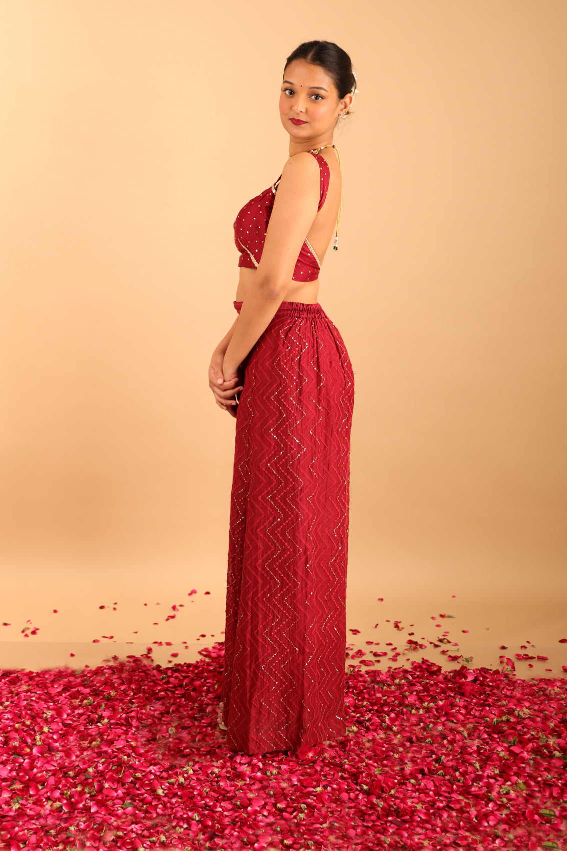 Step into the world of maroon magic with our Sindori Laal Co-ord Set, complete with a matching dupatta. Crafted from chanderi fabric, this set radiates timeless charm and elegance, making it the perfect choice for a range of special occasions.