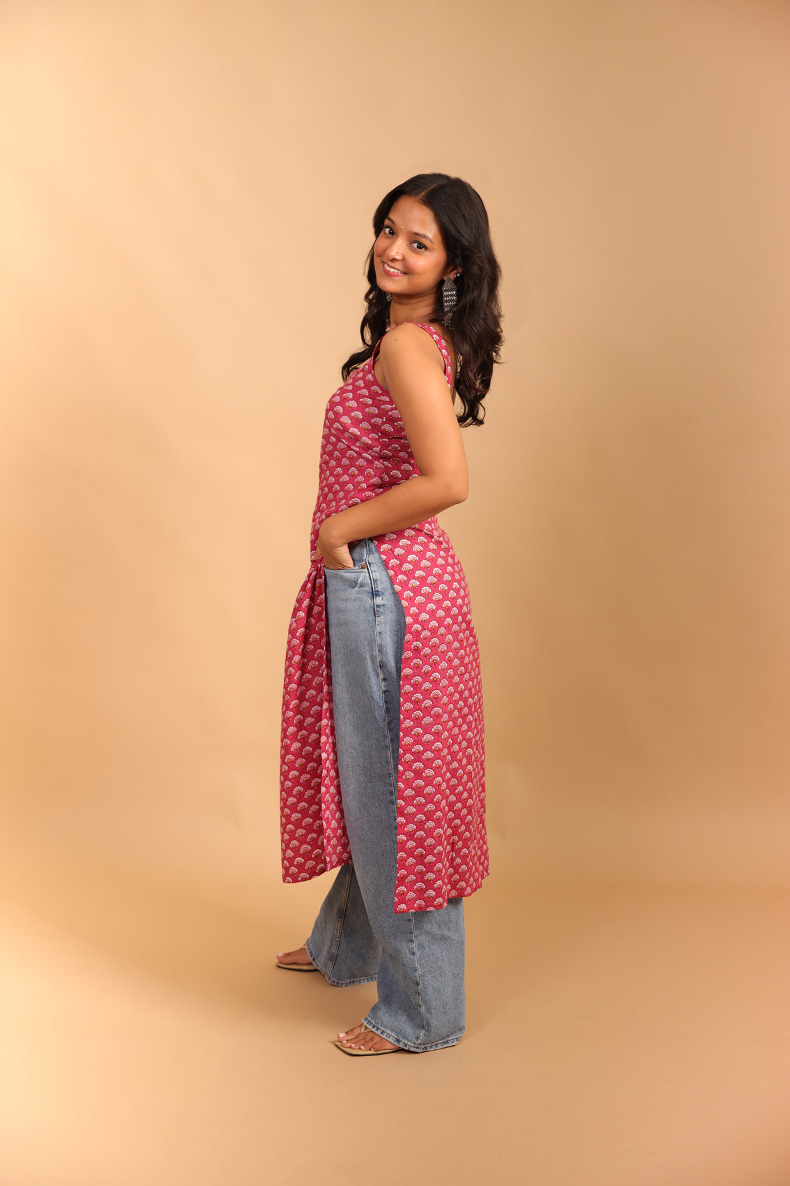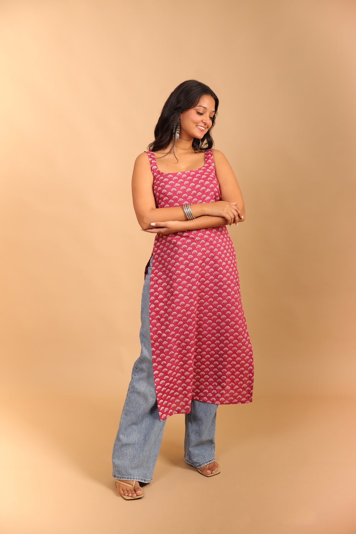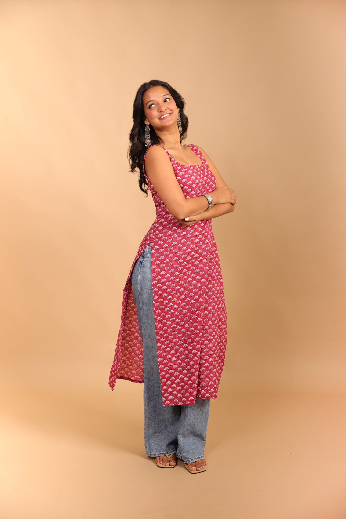 Step into elegance with our Onion Pink Sleeveless Long Kurti, featuring a stylish square neck that highlights a refined silhouette. The straight cut ensures a flattering fit, while the exquisite lace detailing on the back, adorned with shells and ghungroo, adds a unique touch of charm. This kurti effortlessly combines tradition with modern style, making it a versatile piece for various occasions. Pair it with statement jewelry to elevate your look further.