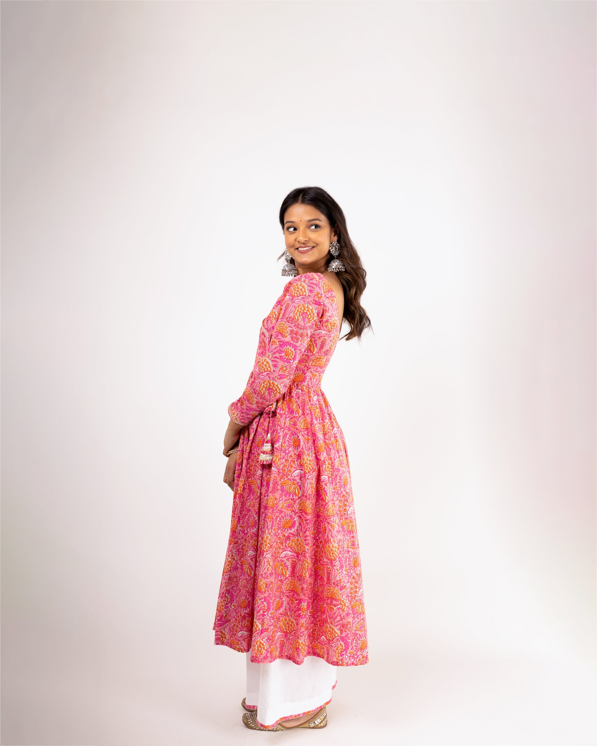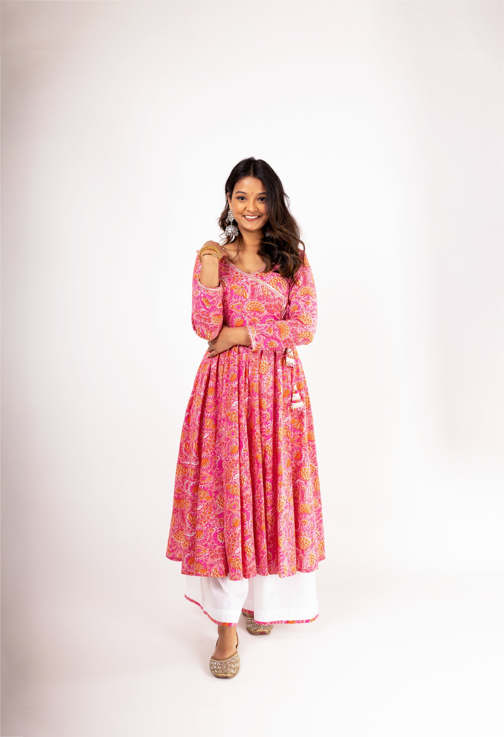This pink floral printed anarkali set comes with a full sleeved flowy kurta accentuated with hand embroidered mirror and sequin work, tie up detailing and tassels, and gota patti and lace work around the neck and sleeves. It is paired with contrasting white elasticated palazzo featuring pink fabric detailing at the bottom and is perfect for a breezy day look as well as can be amped up with accessories for special occasions.