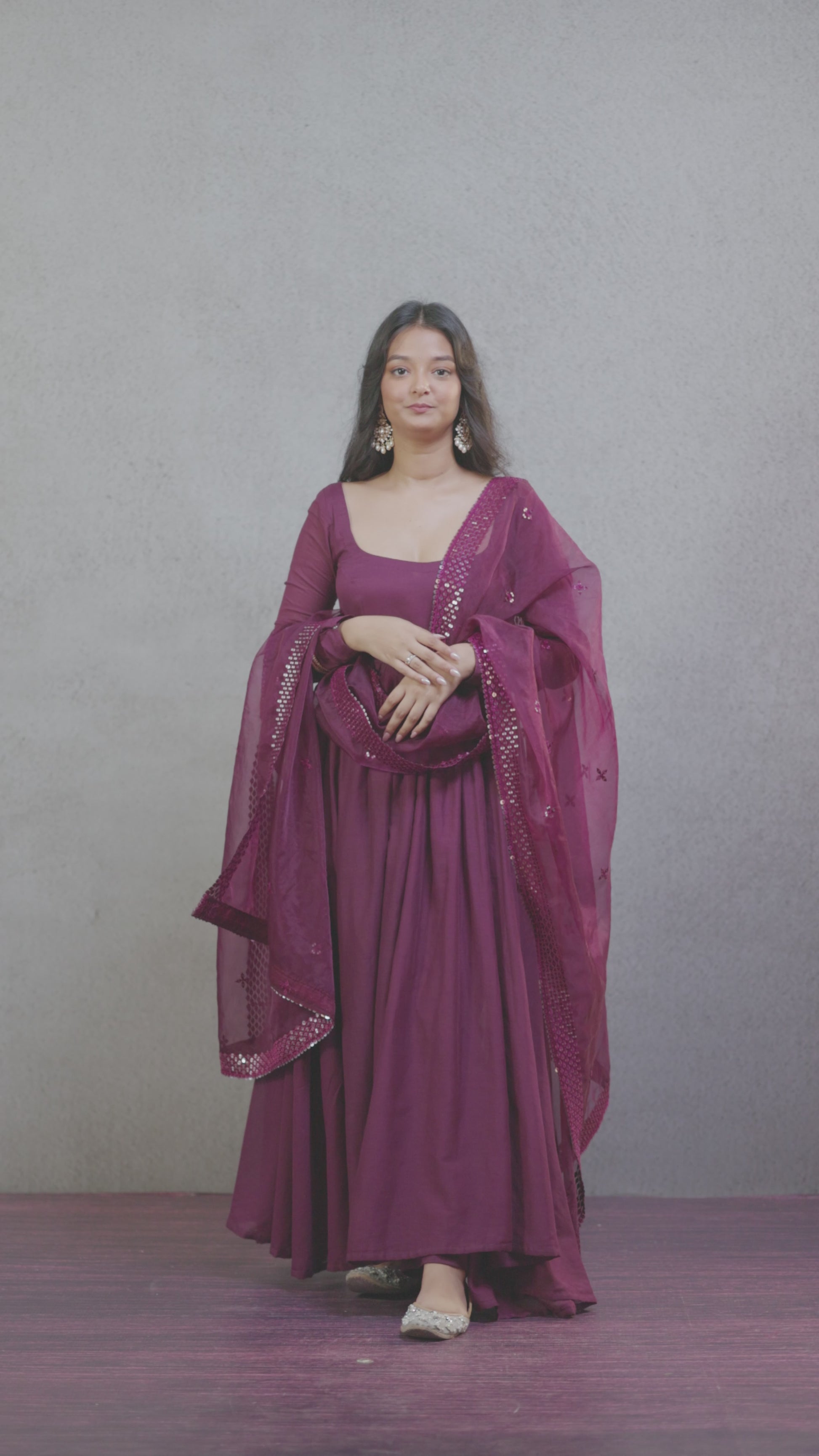 Beautify your festive wardrobe with this elegant Purple Anarkali set that features a plain mulmul kurta, cambric cotton pants and a stunning embroidered organza dupatta.