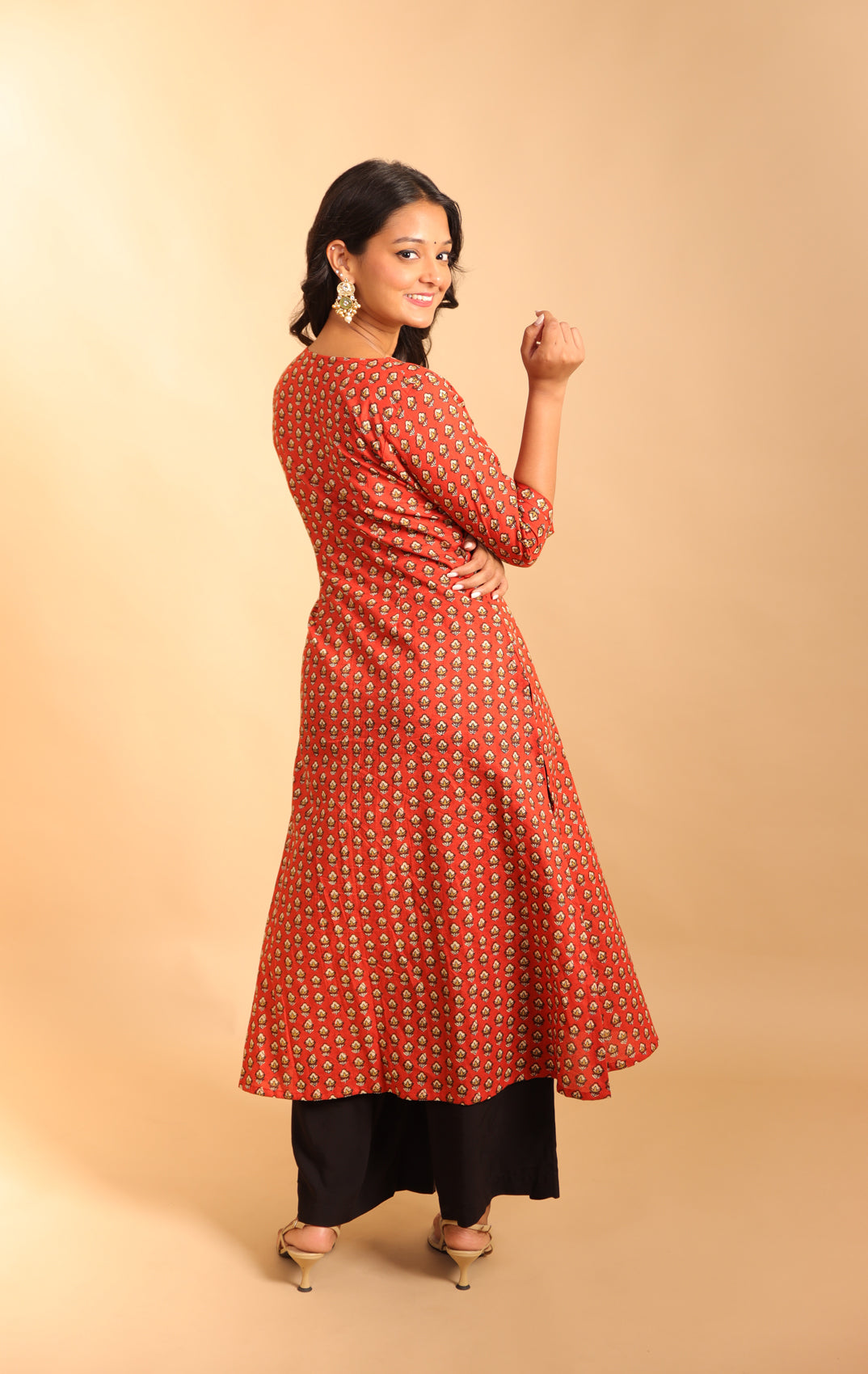 Make a statement with our Rust Maroon Quarter Sleeves Long Kurti, designed with an elegant angrakha-style neck. The neckline and front slit are beautifully adorned with sequins, adding a touch of sparkle to your look. With quarter sleeves that offer both comfort and style, this kurti is perfect for any occasion, from casual outings to festive celebrations. Pair it with your favorite accessories and step into a world of elegance.