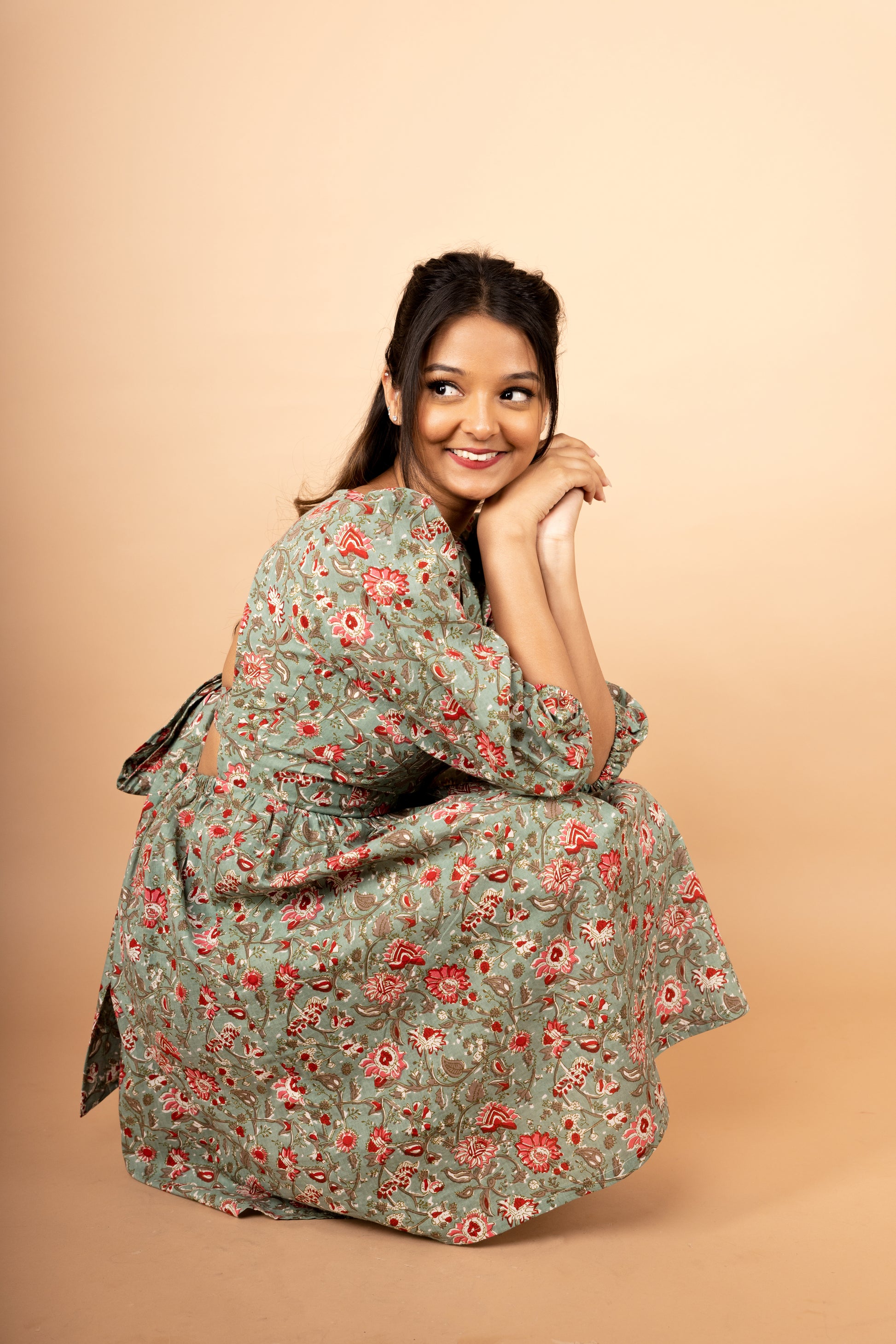 This ethnic skater dress accentuated with a contrasting floral print, balloon sleeves and a back cut out featuring a bow style tie up details is cool and breezy for a chic day look as well as a flattering, sultry look for an evening soiree.